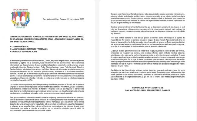 El gobierno municipal de San Mateo del Mar a través de un comunicado confirmó el asesinato de 15 personas, la mañana de este lunes por parte de un grupo del que, señaló, está involucrado el agente municipal de Huazantlán del Río.