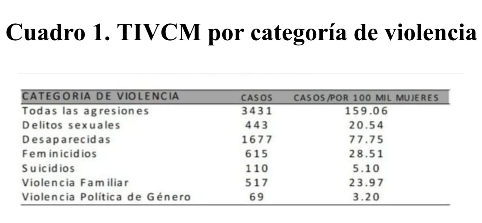 Les siguen la violencia familiar y los delitos sexuales, con tasas superiores a 20 casos por cada 100 mil mujeres. Los suicidios y la violencia política de género presentan 5.10 y 3.20 casos, respectivamente.