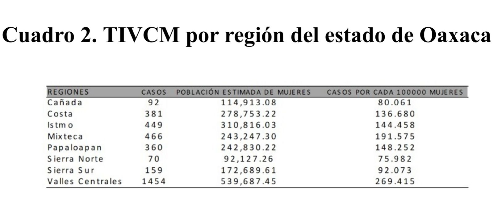 Por regiones, Valles Centrales presenta la tasa más elevada, con 269.41 registros por cada 100 mil mujeres. Le siguen la Mixteca y el Papaloapan, con 191.575 y 148.252 casos, respectivamente