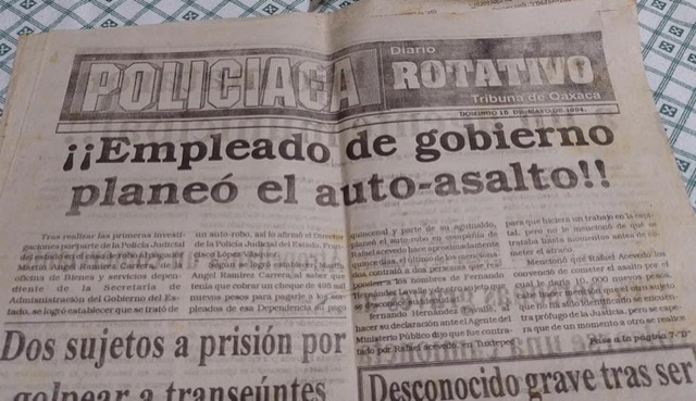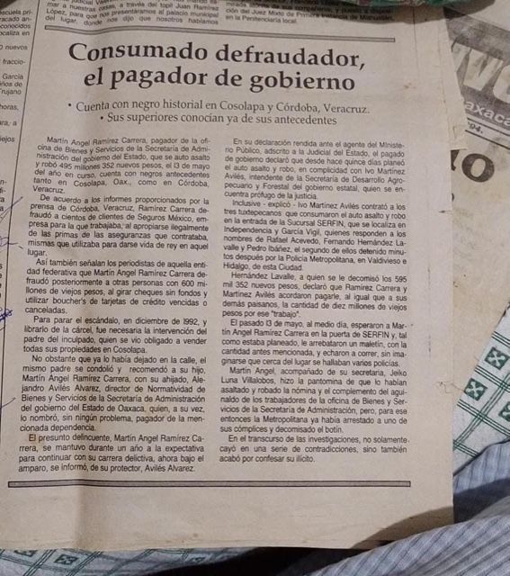 De acuerdo con la información los hechos se registraron en el mes de Mayo de 1994, con la detención de Martín Ángel Martínez Carrera, pagador de gobierno y Fernando Lavalle, tras la investigación el delito se probó plenamente, y se vinculó a Avilés Álvarez, quien en ese entonces se desempeñaba como Director de Normatividad de Bienes y servicios de la secretaría de administración del gobierno de Oaxaca, y a pesar de estar vinculado con el autorobo no fue a prisión y, fue premiado con una ascendente carrera política en el PRI de Oaxaca, que lo ha llevado hoy a ser el único precandidato del PRI a la gobernatura.