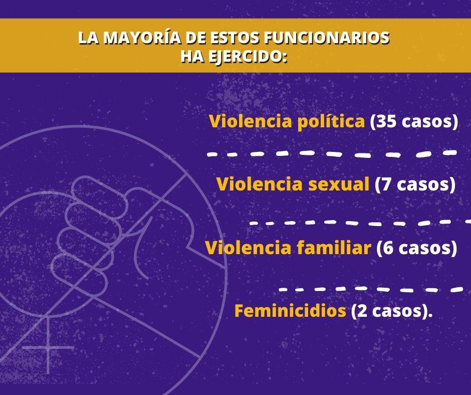 Plataforma de Violencia Feminicida en Oaxaca, la mayoría de estos funcionarios ha ejercido violencia política (35 casos); en segundo orden violencia sexual (7 casos); le sigue la violencia familiar (6 casos) y por último los feminicidios (2 casos)
