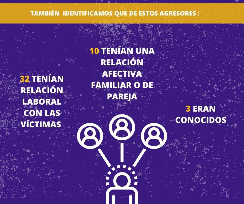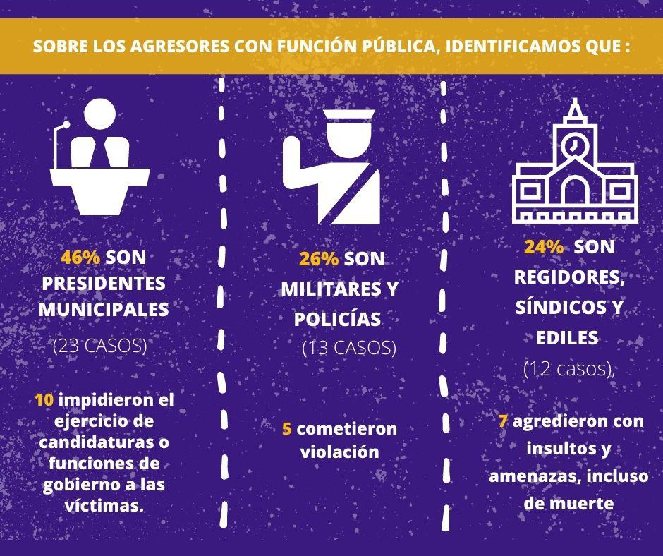 En los casos en que se conoce la ocupación de los agresores con función pública, ya sea en el ámbito político o de seguridad, el 46% son presidentes municipales (23 casos), de los cuales 10 impidieron el ejercicio de candidaturas o funciones de gobierno a las víctimas; 26% son militares y policías (13 casos), de los cuales 5 cometieron violación. El 24% son regidores, síndicos y ediles (12 casos), de los cuales 7 agredieron con insultos y amenazas -incluso de muerte- y 4% son diputados locales (2 casos), 1 caso fue de acoso sexual.