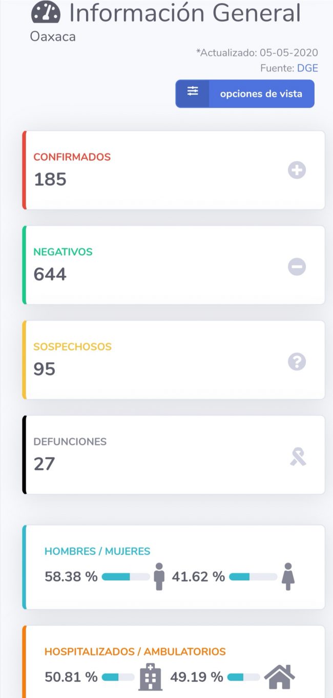 Hasta el momento se tienen CONFIRMADOS: 185 casos positivos; NEGATIVOS: 644; SOSPECHOSOS: 95; y DEFUNCIONES: 27 de los cuales el 58.38 % son HOMBRES y el 41.62 % son MUJERES; el 50.81% están HOSPITALIZADOS y el 49.19% son AMBULATORIOS.
