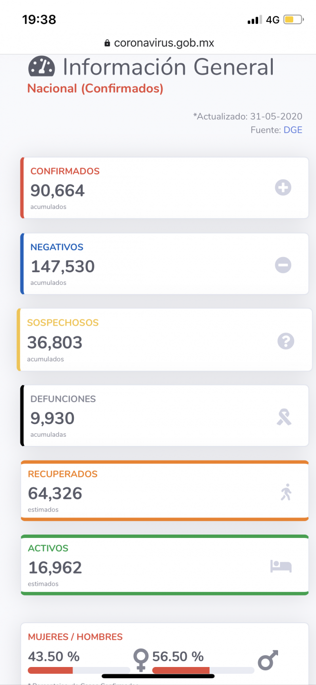 El corte al día de hoy domingo 31 de Mayo la Secretaría de Salud (Ssa) informó que hasta el momento en México se cuenta con 90 mil 664 casos positivos.