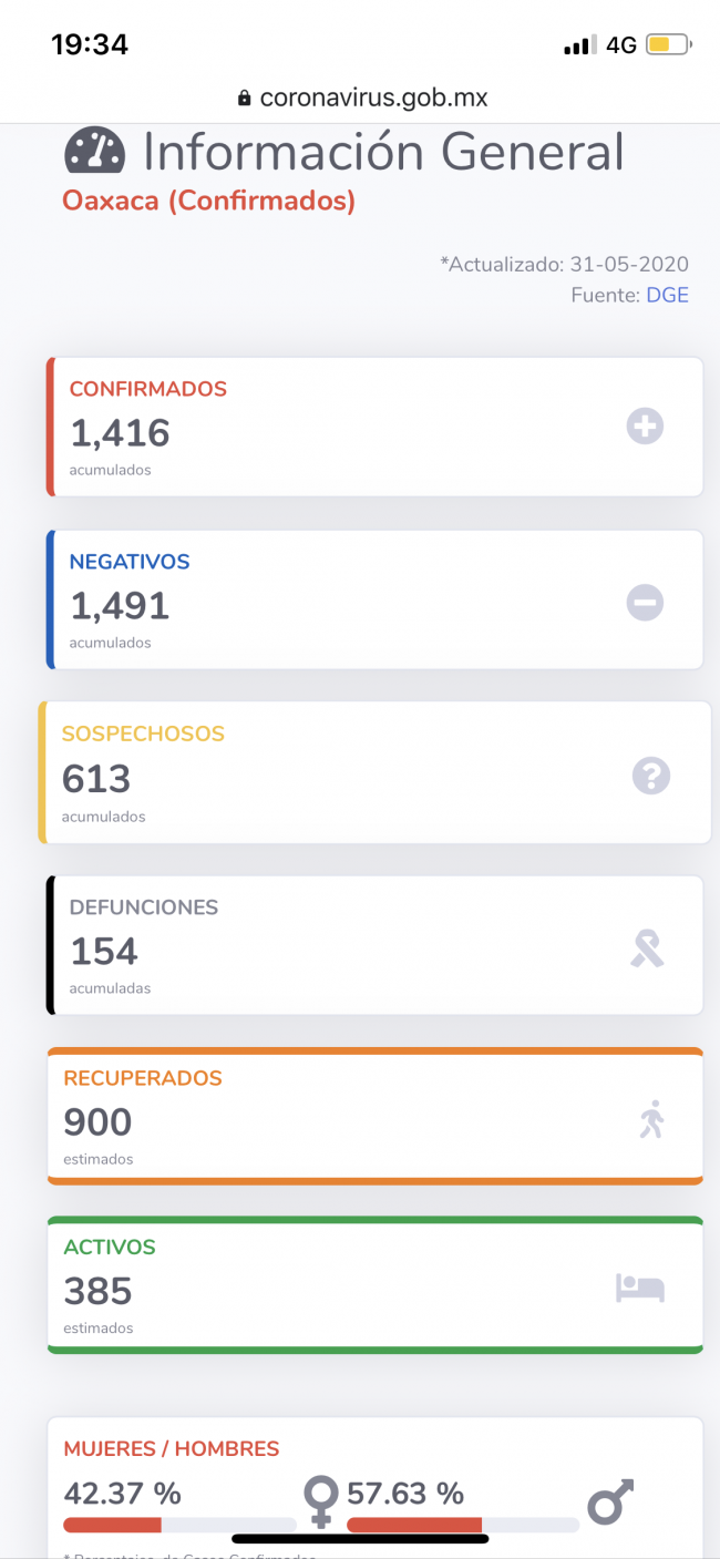 En Oaxaca se registró un aumento de 83 casos llegando a un total de 1,416 positivos, los sospechosos son 613 y la cifra de fallecidos es de 154, seis más respecto al día de ayer.