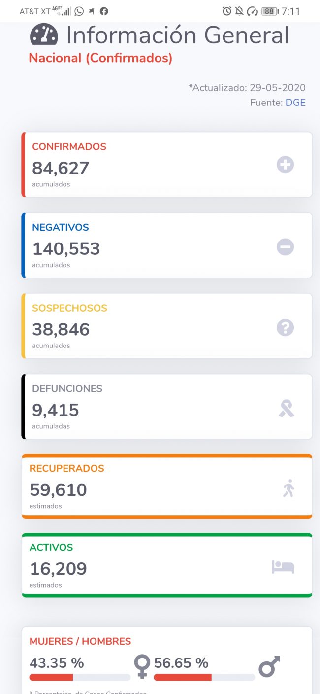 El corte al día de hoy viernes 29 de Mayo la Secretaría de Salud (Ssa) informó que hasta el momento en México se cuenta con 84 mil 627 casos positivos, 38 mil 846 sospechosos y 9 mil 415 defunciones.