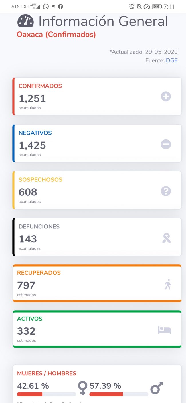 En Oaxaca se registró un aumento de 65 casos llegando a un total de 1,251 positivos, los sospechosos son 608 y la cifra de fallecidos es de 142, 12 más respecto al día de ayer.