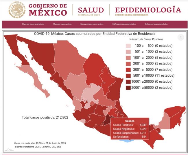 El corte al día de hoy sábado 27 de junio la Secretaría de Salud (Ssa) informó que hasta el momento en México se cuenta con 212 mil 802 casos positivos, 67 mil 099 sospechosos y 26 mil 381 defunciones.