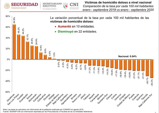 Esta variación porcentual de la tasa por cada 100 mil habitantes de las víctimas de homicidios dolosos disminuyó en 22 entidades entre ellas Oaxaca y es una comparativa de enero a septiembre de 2019.