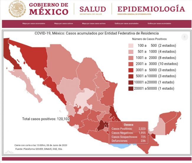 El corte al día de hoy lunes 8 de junio la Secretaría de Salud (Ssa) informó que hasta el momento en México se cuenta con 120 mil 102 casos positivos, 45 mil 317 sospechosos y 13 mil 669 defunciones.