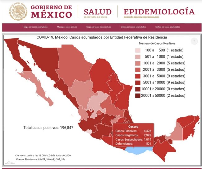 El corte al día de hoy miércoles 24 de junio la Secretaría de Salud (Ssa) informó que hasta el momento en México se cuenta con 196 mil 847 casos positivos, 62 mil 475 sospechosos y 24 mil 324 defunciones.
