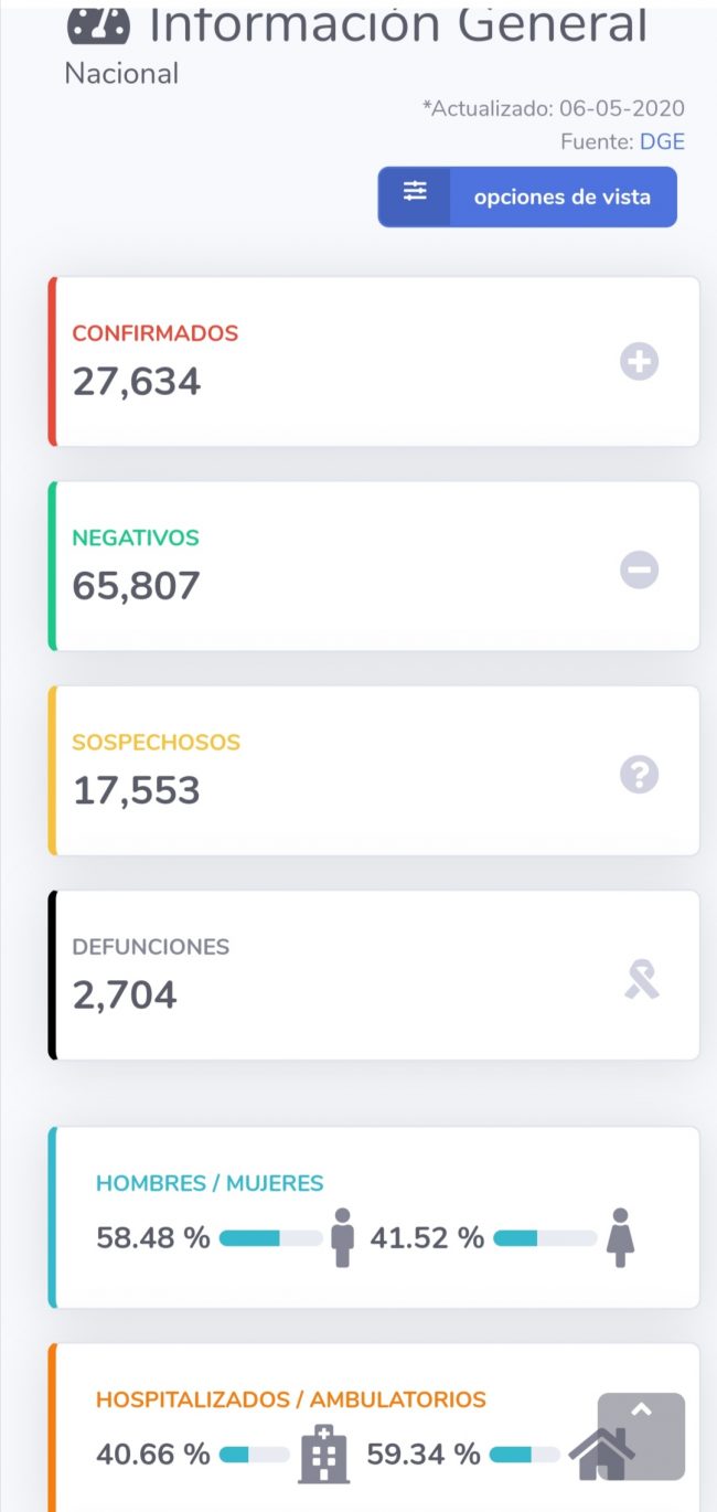 El corte al 6 de mayo del 2020 de la Secretaría de Salud SSa confirmo el aumento de casos por Covid-19 a nivel nacional se tienen CONFIRMADOS: 27,634; NEGATIVOS: 65,807; SOSPECHOSOS:17,553 y DEFUNCIONES: 2,704.
