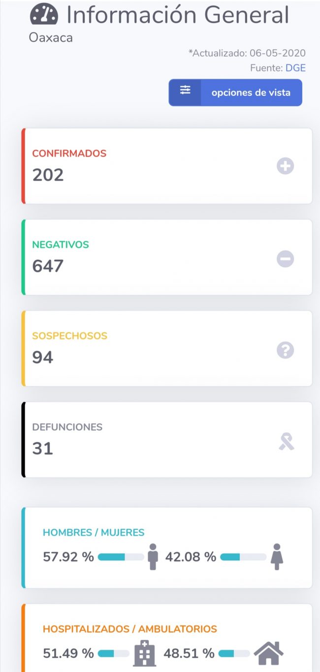 En el estado de Oaxaca los casos aumentaron de manera drástica de 187 que se tenían confirmado el día de ayer hoy se tienen CONFIRMADOS: 202 casos positivos; NEGATIVOS: 647; SOSPECHOSOS: 94 y DEFUNCIONES: 31, 4 casos más que el día de ayer.