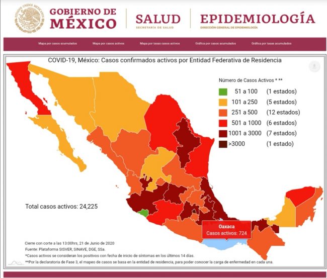 El corte al día de hoy domingo 21 de junio la Secretaría de Salud (Ssa) informó que hasta el momento en México se cuenta con 180 mil 545 casos positivos, 56 mil 590 sospechosos y 21 mil 825 defunciones.