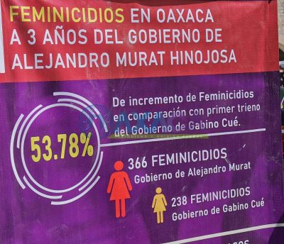 Desde el inicio del sexenio de Alejandro Murat, al día de hoy se han registrado 1, 736 casos de violencia feminicida en sus diversas variables, Consorcio para el Diálogo Parlamentario reportó 368 feminicidios durante los tres años del Alejandro Murat en comparación con los 238 que registró Gabino Cue se estaría hablando de un incremento de 55% por ciento.
