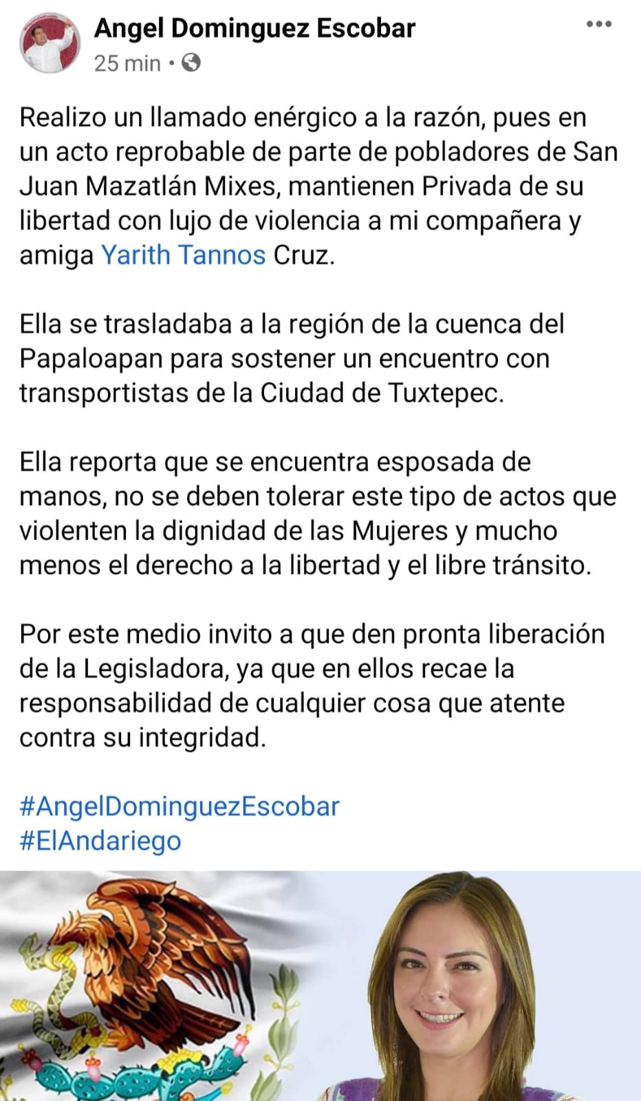 El legislador Ángel Domínguez Escobar, por su parte, utilizó sus redes sociales para exigir la liberación de la diputada Yarith Thannos quien fue retenida “con lujo de violencia” y esposada.