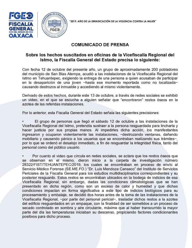 El comunicado menciona textualmente que “El video que circula en redes sociales, se aclara que los restos óseos que se observan en el mismo, dieron inicio a la Carpeta de Investigación número 28322/FIST/TEHUANTEPEC/2019, los cuales se encontraban en proceso de envío al Servicio Médico Forense “Dr. Luis Mendoza Canseco” del Instituto de Servicios Periciales de la Fiscalía General para los estudios multidisciplinarios correspondientes y su posterior resguardo”.