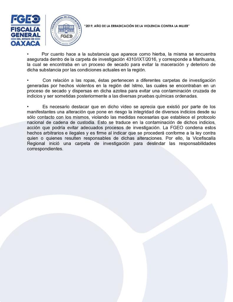 La Fiscalía General del Estado de Oaxaca a través de un comunicado, reconoció que en el techo de la Vicefiscalía Regional del Istmo, ubicada en Tehuantepec, habían osamentas, droga y ropa, pero se trataba de un proceso de secado para conservar indicios y sirvieran para la investigación.