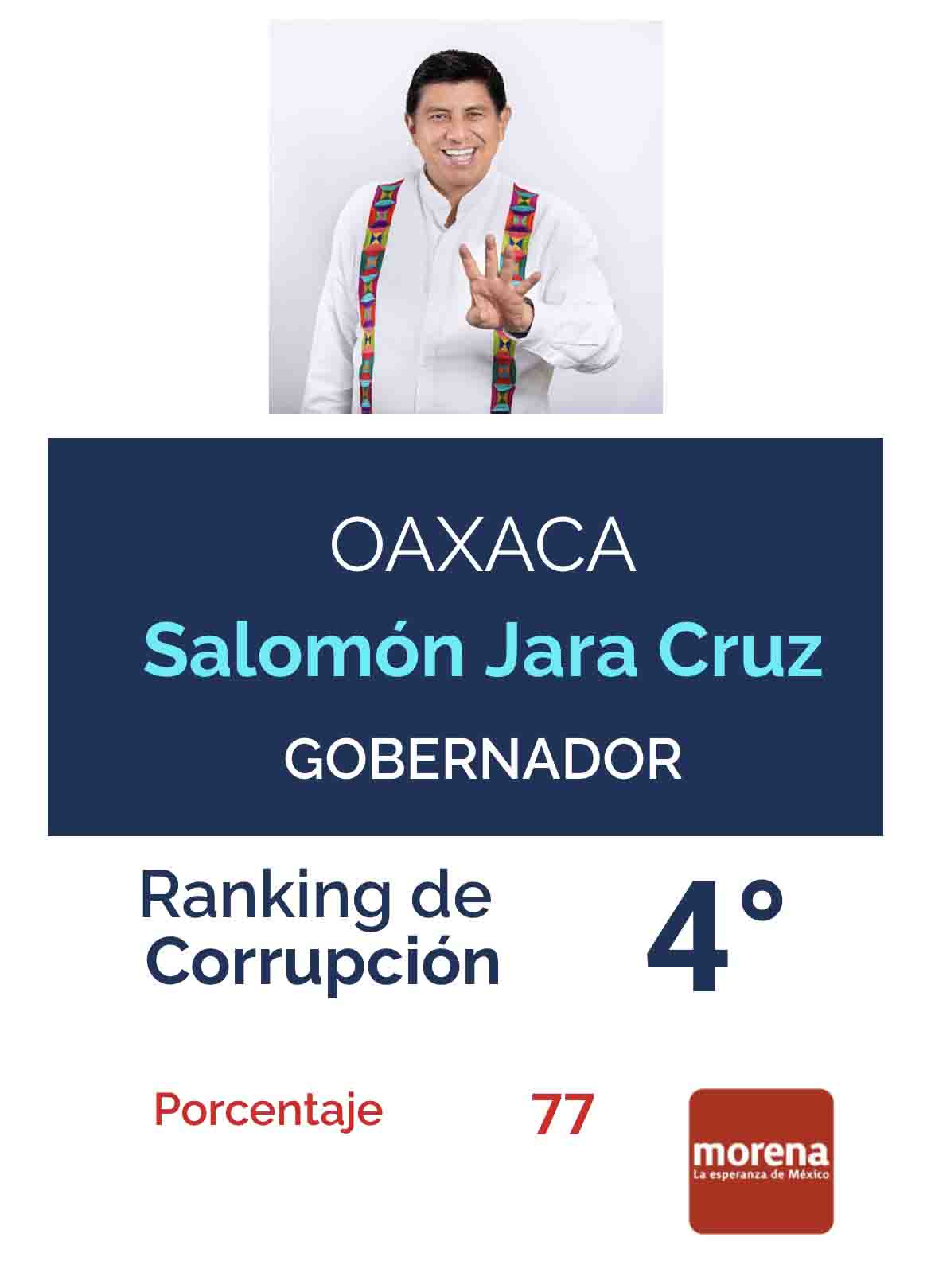 Quien encabeza la llamada cuarta transformación de Oaxaca, cuenta con un porcentaje de 77, en cuanto a corrupción posicionándolo en el cuarto lugar a nivel nacional, en el primero aparece David Monreal de Zacatecas, Rutilio Escandón de de Chiapas y Layda Sansores de Campeche, todos de extracción morenista, en quinto lugar aparece Cuauhtémoc Blanco de Morelos, por parte de encuentro ciudadano, lejos de no robar, no mentir y no traicionar, pareciera que entendieron lo contrario.