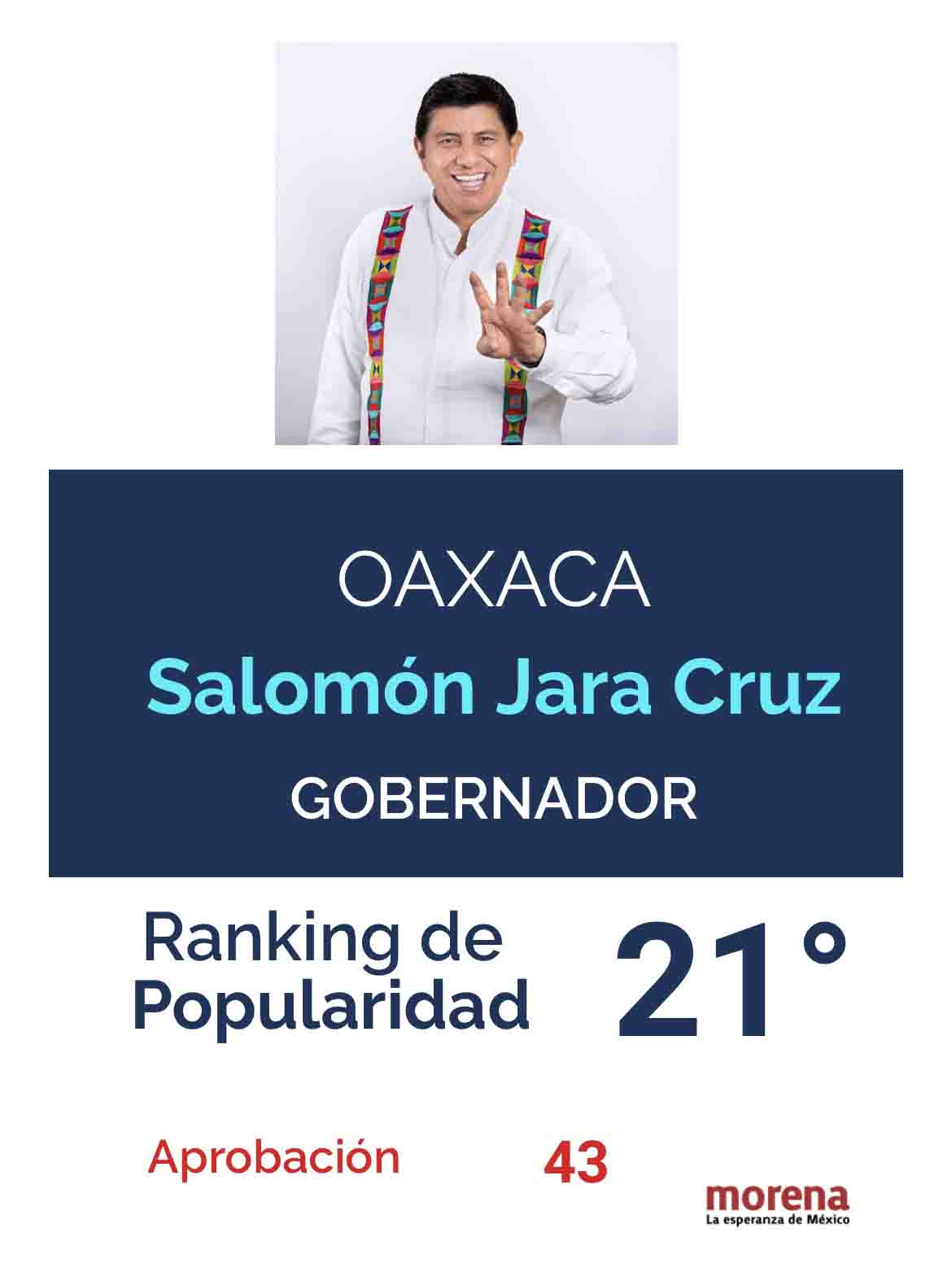La popularidad del oriundo de San Melchor Betaza sigue a la baja pues apenas el 43% de los encuestados la aprueba posicionándolo en el lugar 21 de 32, cabe señalar que Salomón Jara, ganó las elecciones con el 22% del padrón electoral.