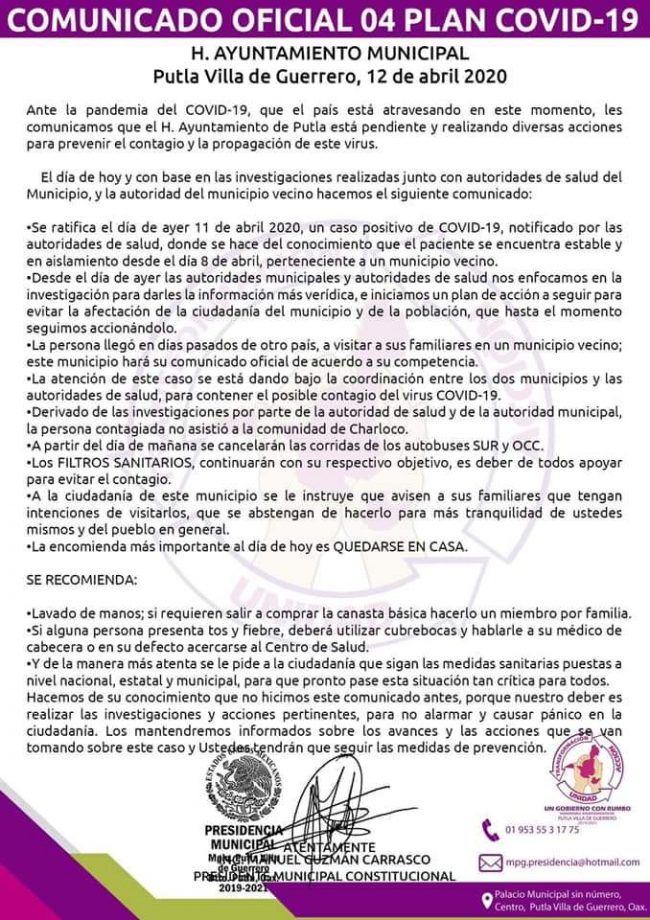 El H. Ayuntamiento de Putla de Guerrero a través de un comunicado informó que el día de ayer 11 de abril de 2020, salió positivo un caso de COVID-19, notificado por las autoridades de salud, donde se hace del conocimiento que el paciente se encuentra estable y en aislamiento desde el día 8 de abril.