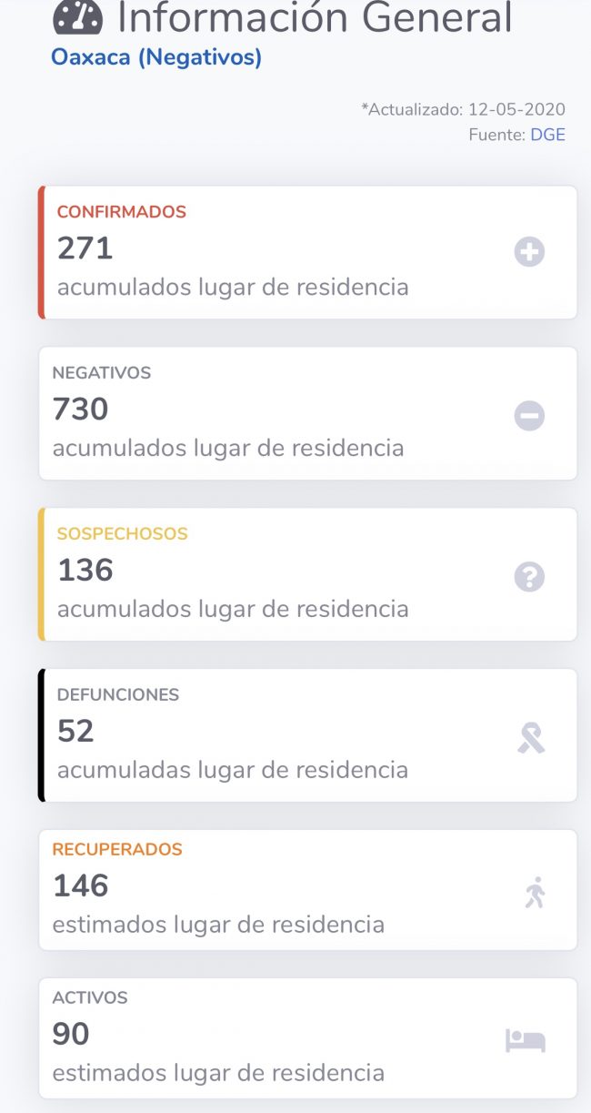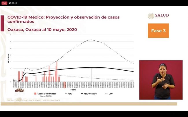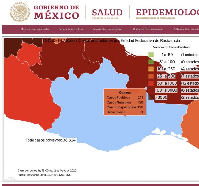 De acuerdo a la gráfica presentada por López Gatell, Oaxaca lleva un retraso de 4 semanas en comparación con la CDMX y al corte de este día martes 12 de mayo se tienen 271 casos confirmados; 136 sospechosos y 52 defunciones.