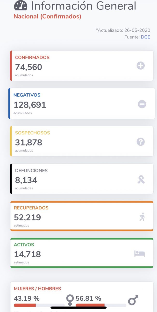 El corte al día de hoy martes 26 de Mayo la Secretaría de Salud (Ssa) informó que hasta el momento en México se cuenta con 74 mil 560 casos positivos, 31 mil 878 sospechosos y 8 mil 134 defunciones.