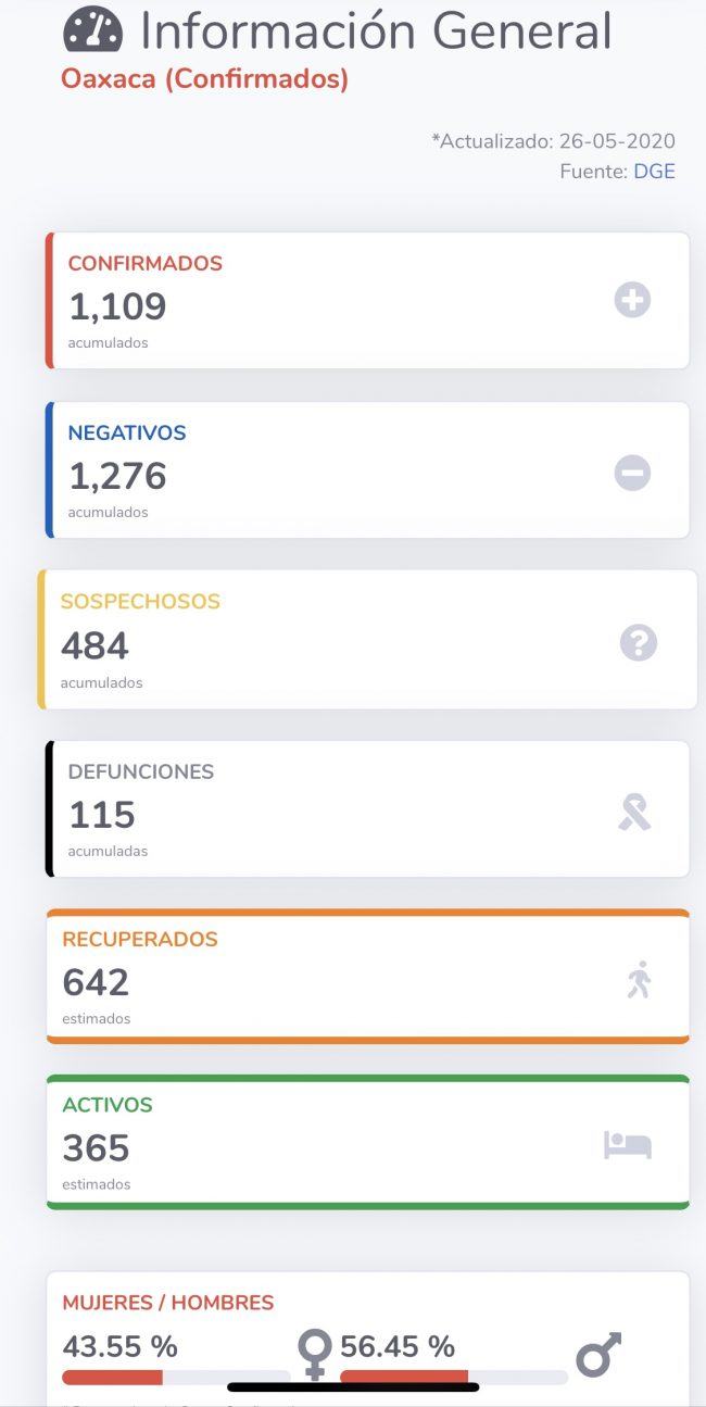 En Oaxaca se registró un aumento de 39 casos llegando a un total de 1,109 positivos, los sospechosos son 484 y la cifra de fallecidos es de 115, ocho más respecto al día de ayer.