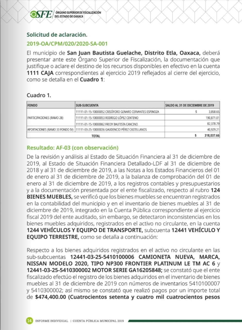 A través de la orden de auditoría Financiera OA/CPM/020/2020, el órgano superior de fiscalización del Estado de Oaxaca OSFE, realizó una investigación de presupuestos del año 2019 en el municipio de San Juan Bautista Guelache, en el distrito de Etla.