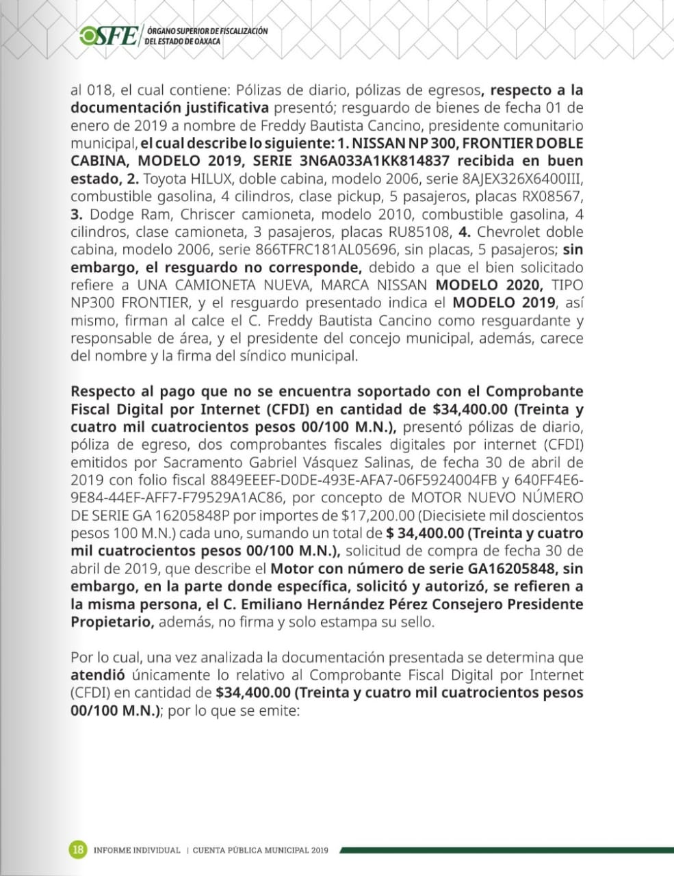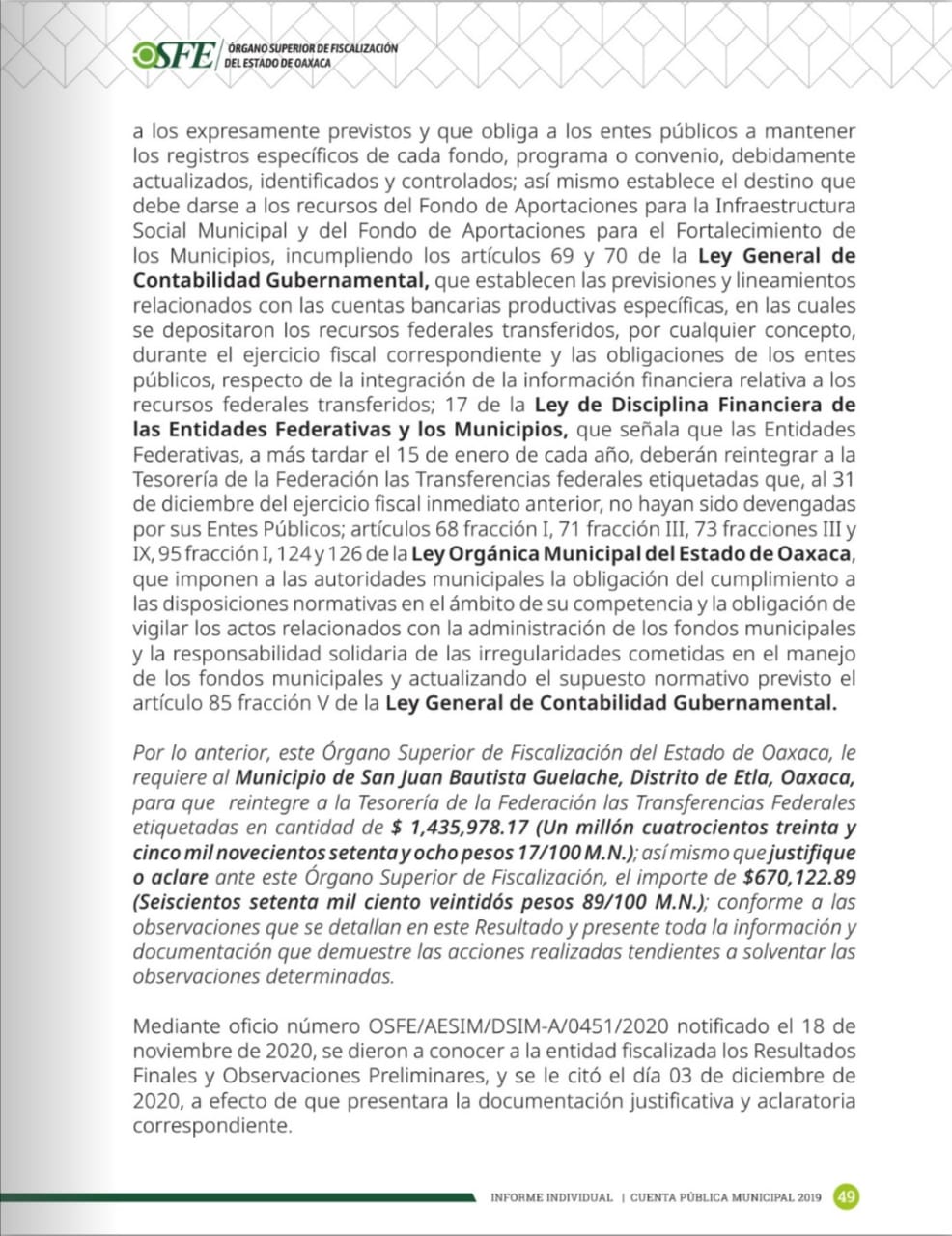 Es decir la administración de Emiliano Hernández, nombrado por la Secretaría General de Gobierno para estar al frente de San Juan Bautista Guelache, no realizó una gestión eficiente y transparente de los recursos ministrados, apegada a la normatividad que regula su ejercicio.