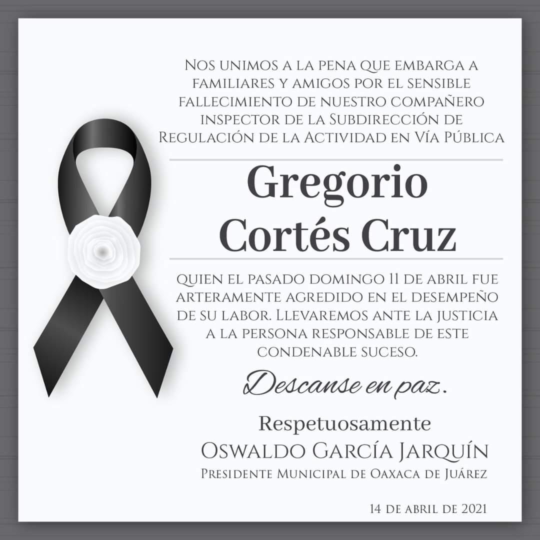 La noche de ayer miércoles Gregorio Cortés Cruz, inspector del Municipio de Oaxaca de Juárez, murió en un hospital de la ciudad tras agonizar por tres días desde que fuera golpeado brutalmente por un comerciante de origen salvadoreño.