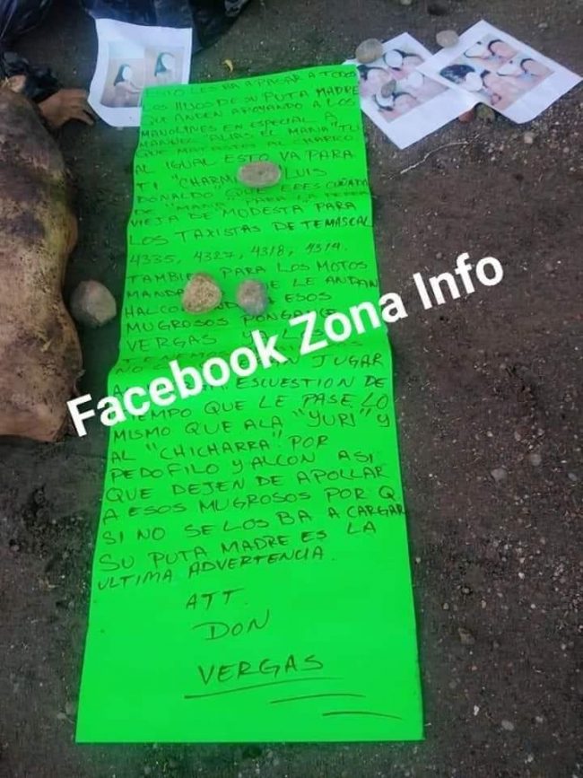 Durante las diligencias correspondientes se identificó que los restos humanos eran de al parecer, dos personas del sexo masculino, los cuales estaban mutilados de sus extremidades, y con una cartulina color verde con un mensaje amenazante hacia varios personajes de la región y hasta taxistas.