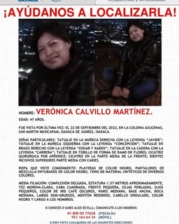 zona podría tratarse de Verónica C. Martínez, quien fue reportada como desaparecida el pasado 22 de septiembre, en la colonia Azucenas de la agencia de San Martín Mexicápam, ciudad de Oaxaca.