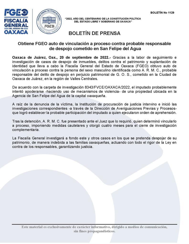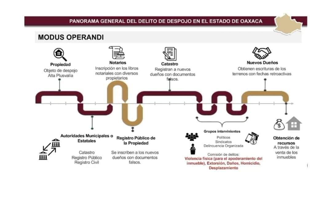 De acuerdo con la Fiscalía de Oaxaca existen mil 400 carpetas de investigación por el delito de despojo en la entidad, la mayoría de ellos se concentran en Valles Centrales, Istmo y Costa, por lo que con esta detención comienzan a desarticular a los grupos que se dedican al robo de propiedades.