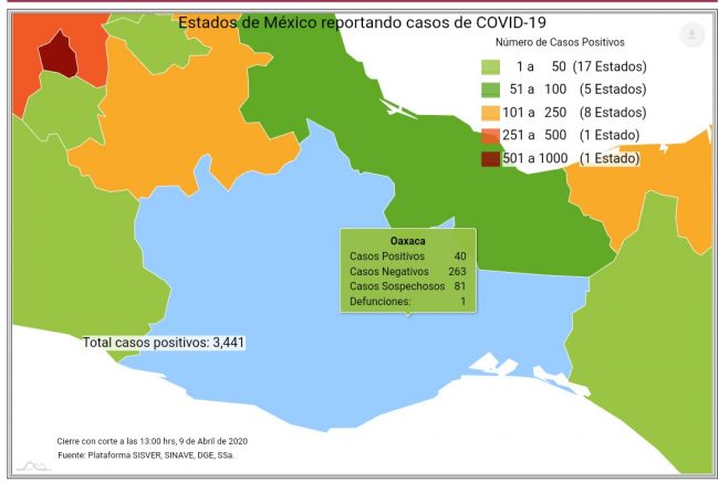 En Oaxaca los casos positivos van en aumento contabilizando hasta el día de hoy a 40 personas que han dado como positivo a coronavirus, Covid-19, los casos sospechosos son 81 y la cifra de fallecidos se mantiene en uno.